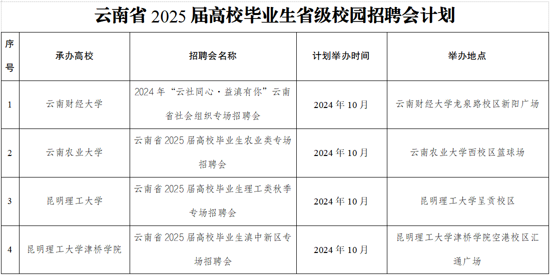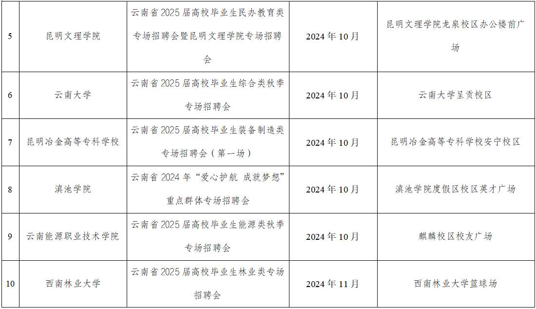各场招聘会的具体举办时间、报名方式和参会要求都将在举办前至少2周,在云南高校毕业生智慧就业平台、承办高校就业信息网发布,有招聘需求的用人单位和毕业生可关注报名。
